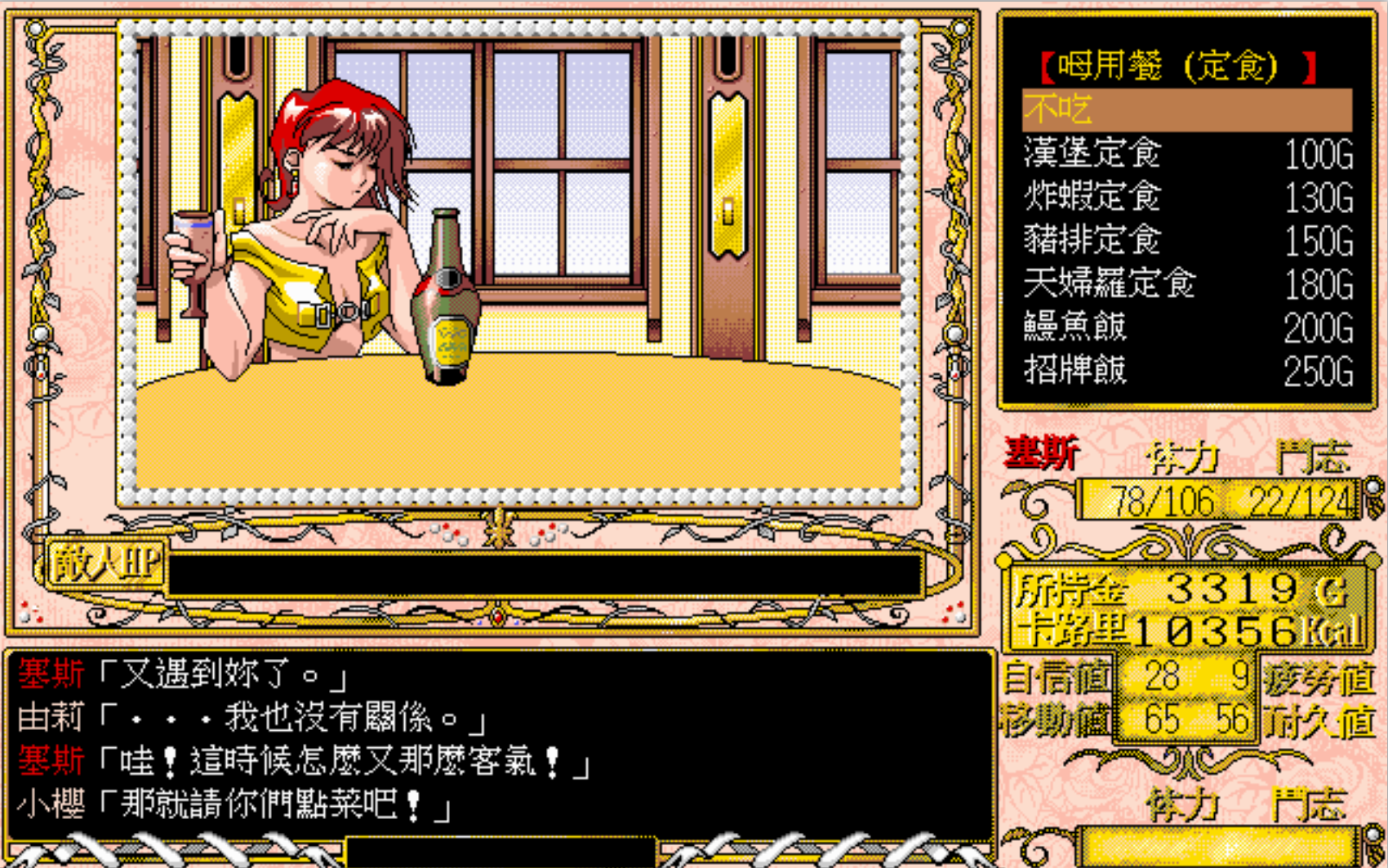 游戏中有运动量和卡路里的设定,直接决定了战斗力,以及主角的体型和在美女眼中的形象。每次体型变化都会被吐槽。吃饭是游戏中最重要的环节,进入迷宫之前都需要饱餐一顿,要不然别说伤害,能打中怪物都很困难。