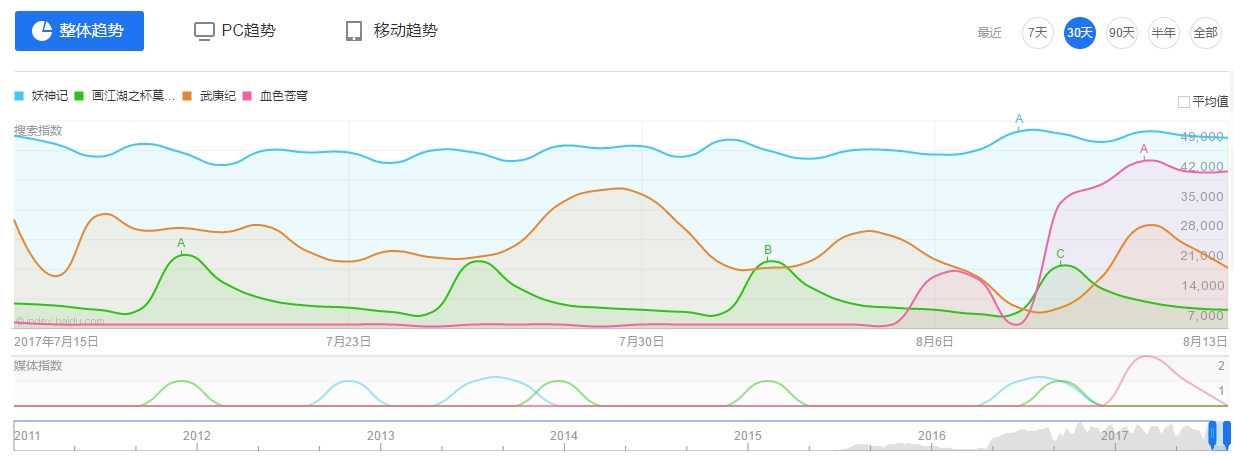 数据来源:爱奇艺视频播放趋势《妖神记》动画网剧在优酷、爱奇艺、腾讯视频、bilibili四大平台上线至今,全网累计播放量超过3亿,其在b站和爱奇艺的月播放量战胜了若森的《画江湖之杯莫停》。对比热播的《武庚纪》和即将上线的《血色苍穹》,《妖神记》的百度指数也丝毫不逊色。