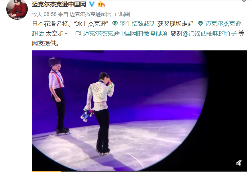 是的,你没有看错,发布这条微博的博主,是迈克尔杰克逊中国网官方微博。而它转发的,正是冰迷在四大洲锦标赛上拍到的,颁奖典礼后,羽生结弦在冰面上、模仿mj最知名的太空步的视频!