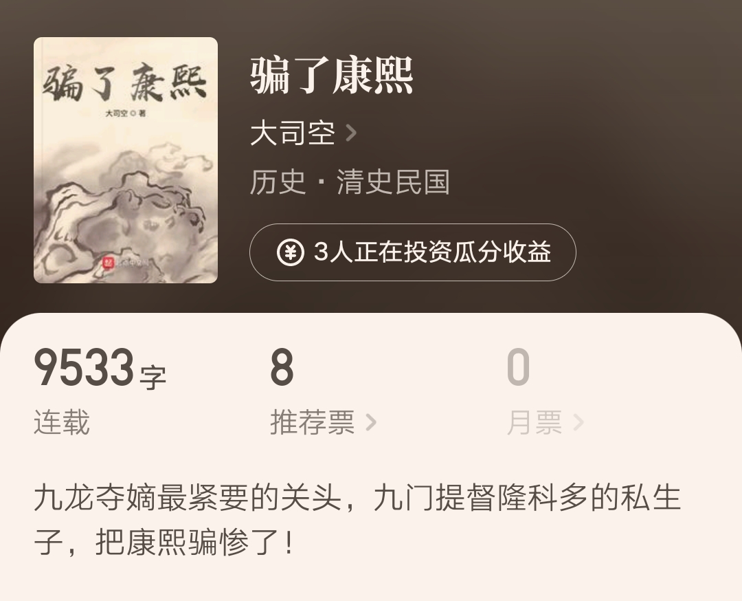 他就是大司空,以前的官文大神,写过官场小说《领导》,后来官场小说不给写了,他就写历史了。然后一本《逍遥侯》从2014年写到现在,七年了还没完结,就是成绩很差。如今开了新书《骗了康熙》,写清朝题材了,也不知道你是否感兴趣呢?