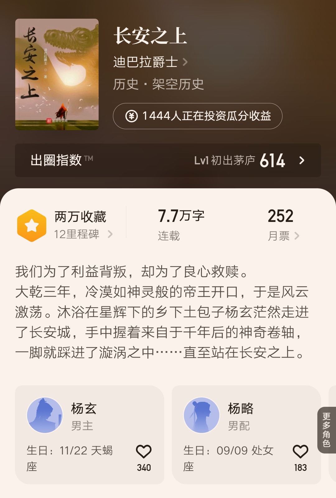 而看到架空,我又想到另一位历史大神迪巴拉爵士的新书《长安之上》也不写纯历史小说了,反而同样是带着修炼元素的架空文,也不知道他们这些大神是不是商量好的。