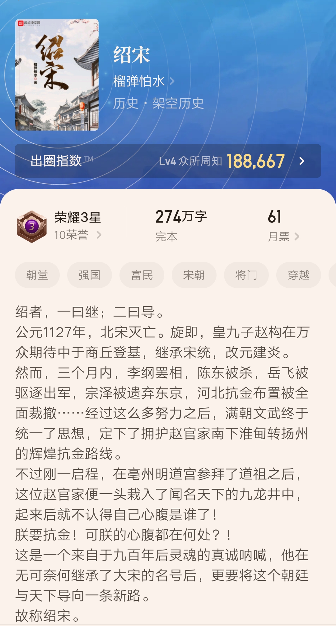 而凭借这两本口碑非常高的小说,他也成为了起点历史分类近几年最突出的大神之一。如果你喜欢看历史小说的话,可以试试他的作品。