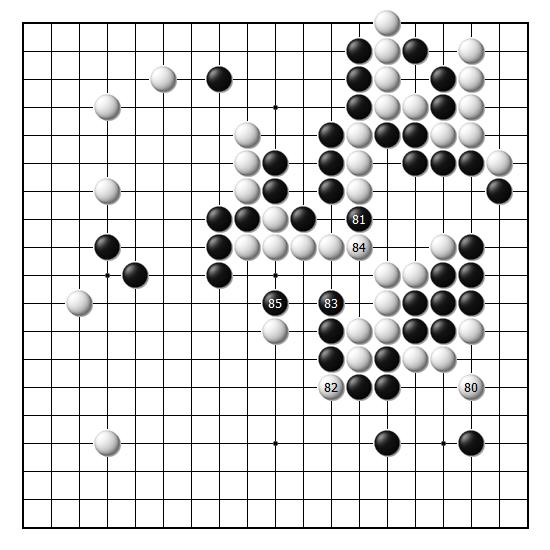 如图,在上方的首次作战黑棋稍占上风,胜负关键转移到中央的攻坚战,白80是最终败着。随着黑85切断白棋,胜负已经明朗。82这一手棋慢了1拍。