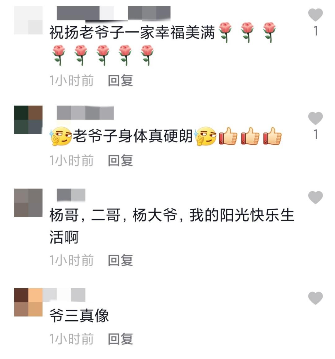 网友看了杨少华和两个儿子的相处日常,有人一眼就认出了他们,还想起曾经的电视剧《杨光的快乐生活》。也有网友称赞杨少华老爷子身体真硬朗,祝福他生活幸福美满。还有网友被父子三人的长相所惊呆,直呼爷仨好像。