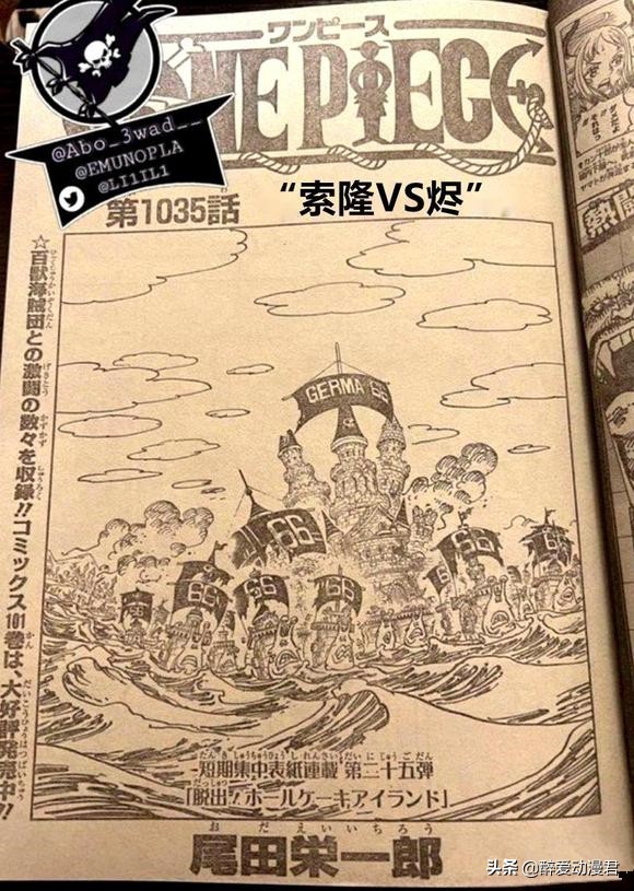 #海贼王#我们知道这周更新了海贼王最新一期的动画1035话,目前漫画已经更新,本话标题为“索隆vs烬”,看来这一话之后,索隆和烬的战斗也算是直接结束了吧!而扉页则是开始连载杰尔玛66逃离四皇大妈领地的过程。