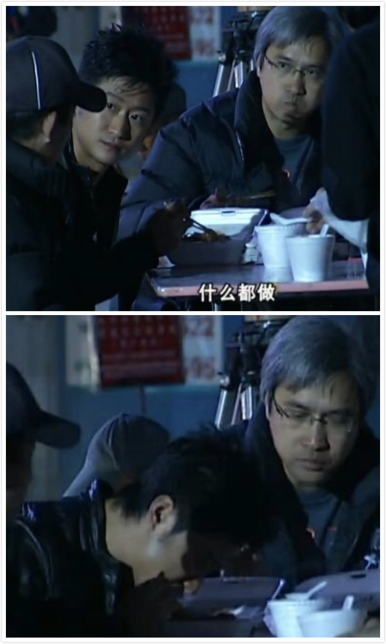但陈木胜一看到吴京就很高兴,拍完戏一起在街边吃便当,边大口吃饭一边聊电影。