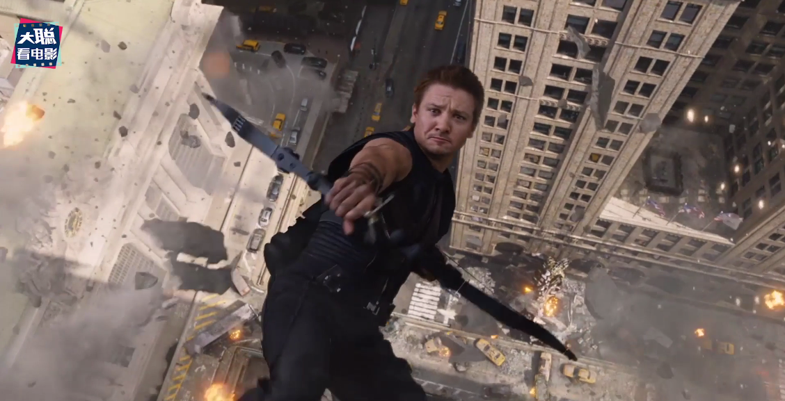 这里鹰眼和齐塔瑞军队对打,鹰眼纵身一跃,在《复联》中都有展现到,算是无缝连接了当时的另一个视角看鹰眼了。
