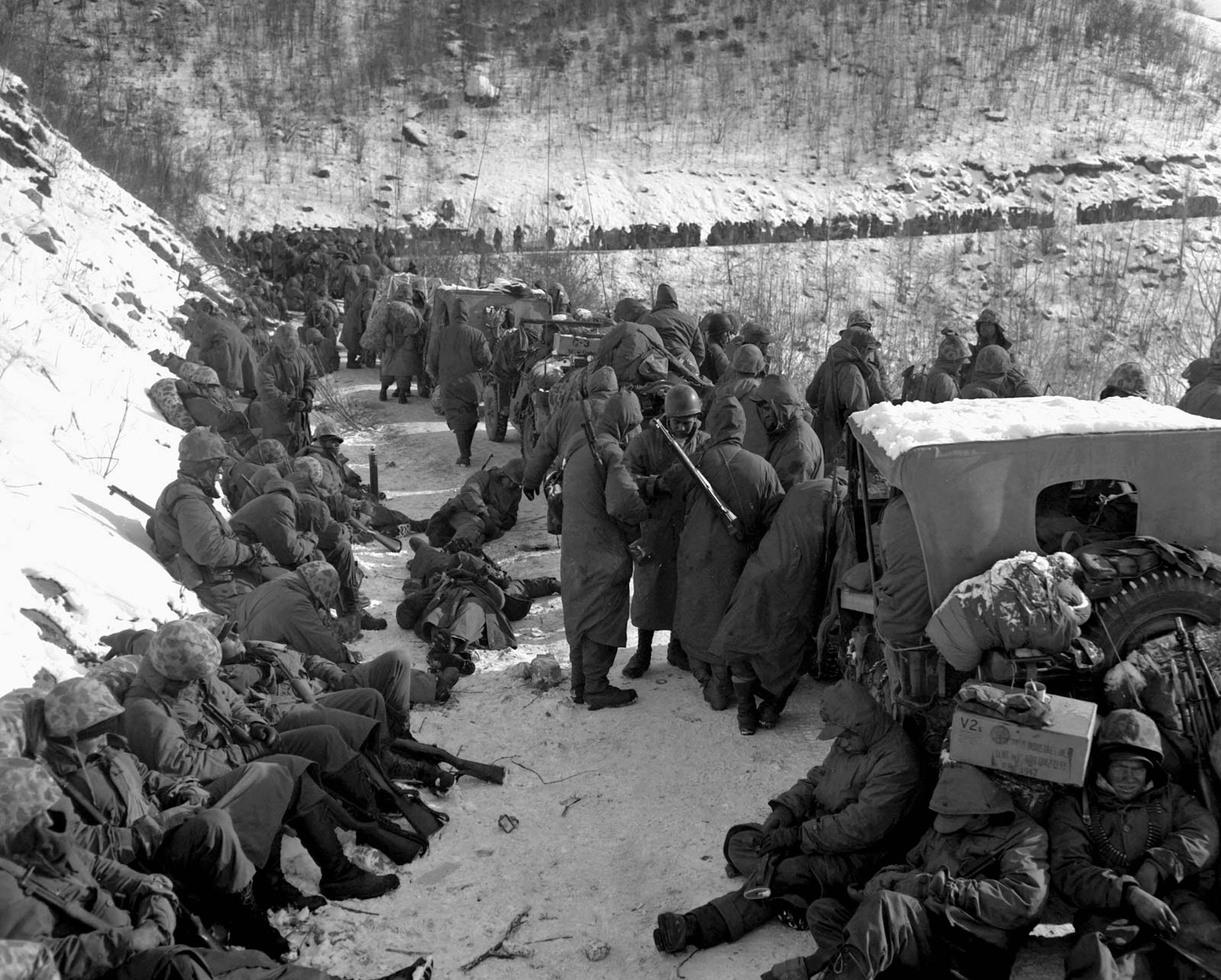 为了保证阵地安全,防止志愿军突袭,麦克劳斯基让士兵两人一组在单人掩体内布防,掩体内的两个人轮流值班,一个放哨,另一个就休息,如此循环。考虑到便于互相照应,所有掩体基本上只间隔三四米,有什么事喊一嗓子大家都能知道。