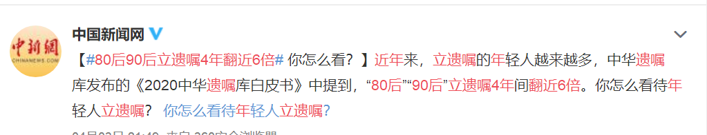 近期,年轻人立遗嘱的事越来越普遍,据统计,80后90后立遗嘱四年已经翻了近六倍。