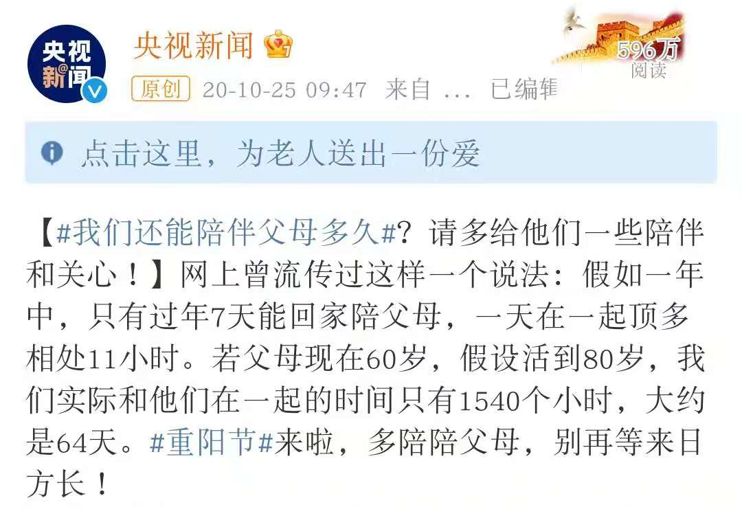 你每年只有7天能回家陪父母,除去睡觉,每天相处的时间大概可以按11个小时来计算。