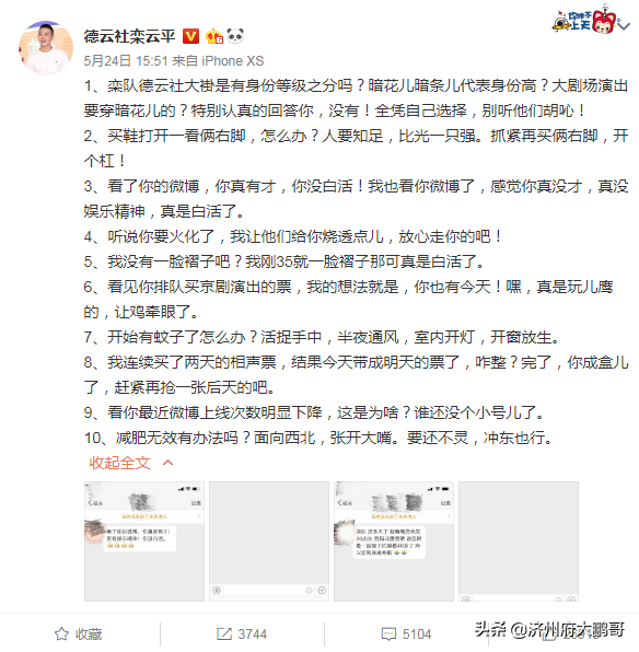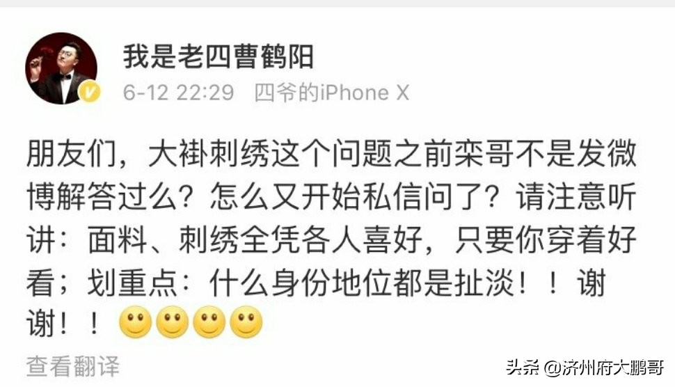 这事儿,能说栾云平,曹鹤阳,烧饼们不对么?不能,因为德云社并没有明文规定大褂的穿衣规则,我们不能说“栾怼怼”说的不对。