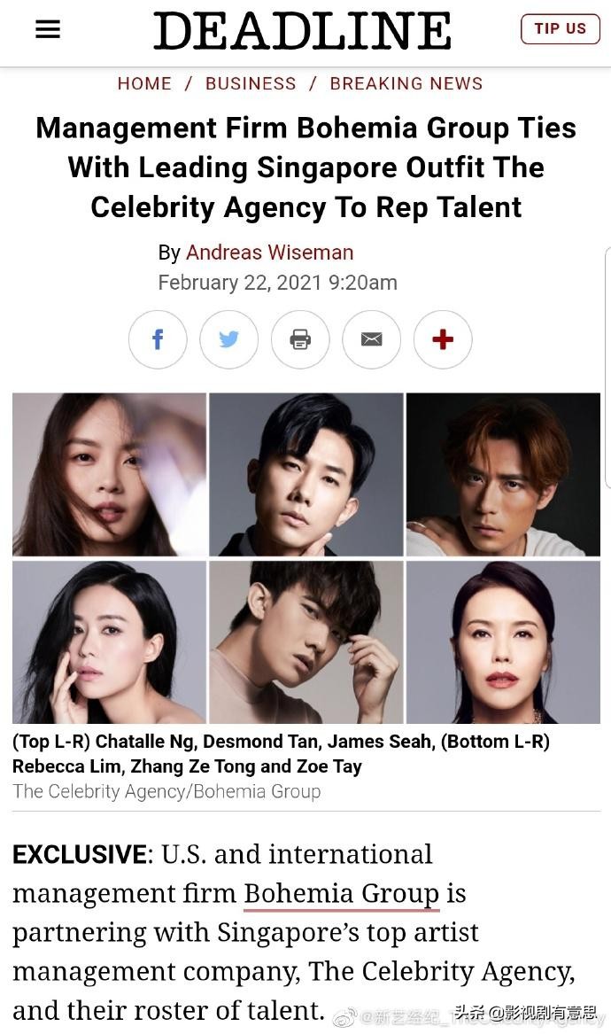 而这两部电视剧来自同一家制作公司——新传媒。新传媒是新加坡最大的内容创建企业和多媒体机构。而新传媒集团的脚步不止于此。其旗下的新艺经纪正在致力于将更多的艺人带向更为广阔的平台。2月23日,新艺经纪通过微博宣布了与美国三家顶尖经纪公司合作,为新加坡艺人争取更多国际项目的机会。合作内容包括与 bohemia group 建立合作伙伴关系,与the gersh agency (合作艺人包括刘嘉玲、马东石等)及 luber roklin entertainment 携手为旗下艺人方展发规划和发展他的海外演艺事业。