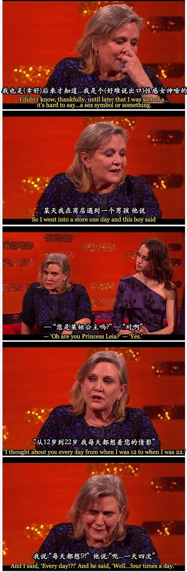 曾经,凯丽在书中写到,她第一天到《星战》片场拍摄时,卢卡斯骗她说,穿那条白裙子时不可以穿胸罩。还一本正经地告诉她,太空中会失重,所以人体会膨胀,而胸罩不能膨胀,穿着胸罩的话,会被勒死。