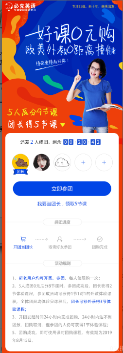2、参团成功后,团长获得2节体验课程,参团成员均可获得1节1对1的外教体验课程,全体团员均体验完课程后,团长可额外获得3节体验课程;