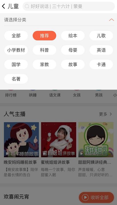 在首页分类里面,找到儿童分类后,可以看到,里面有绘本、儿歌、科普、英语、国学、故事等等板块,只要精心选择一个好主播,接下来可以说很省心了。