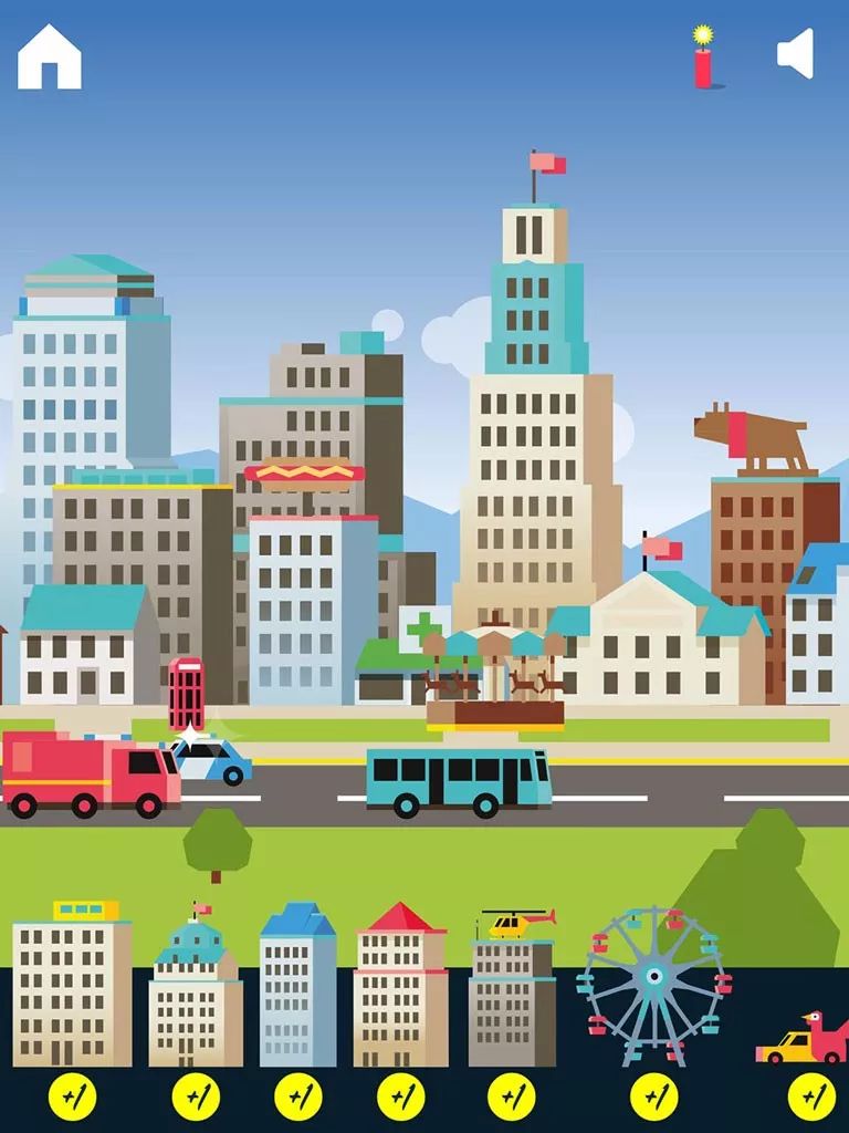而且,每个级别的游戏中,都可以解锁不同的物品:汽车、观光车、救护车和摩天大楼等,增加了学习的趣味性。
