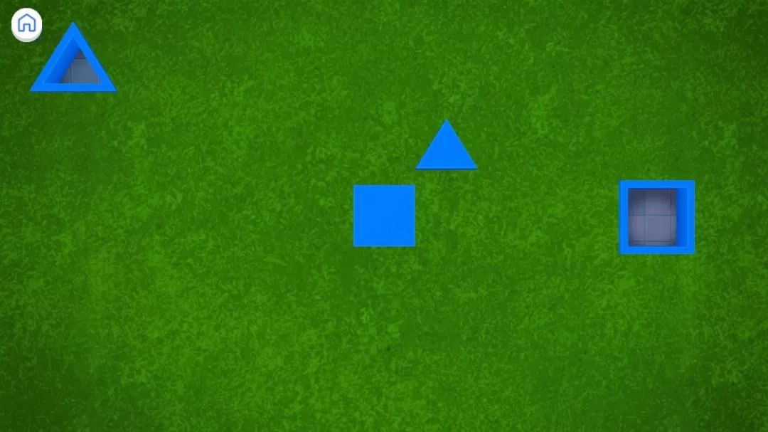 app界面很简单:干净的画面上有不同形状和颜色的框架,比如拖动蓝色的三角形到左上角三角形的框架里,正方形拖到正方形的框架里。