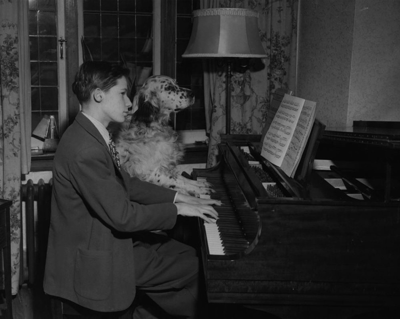 gould和他的宠物们:一只名叫“莫扎特”的鹦鹉和小狗nick,1946年2月