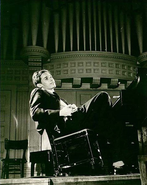 古尔德在多伦多皇家音乐学院(royal conservatory of music),坐着他那把著名的小破椅子,1956