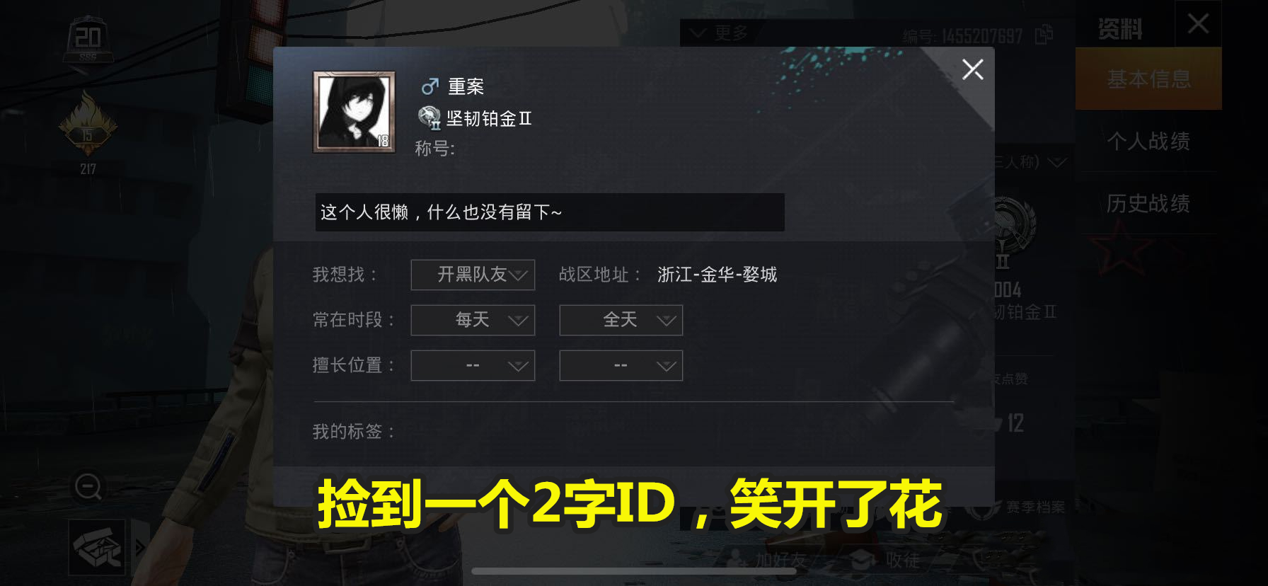 现在和平精英游戏中2字有意义的id基本上都被注册了,但是这世界上没有绝对的事情,上图所示,这位玩家随手敲了两个字,没想到竟然没有被注册,这位玩家捡到了一个2字id-重案,顿时笑开了花。所以如果你也想注册一个2字有意义的id,可以多动一动脑子,相信你一定能想到一个没有被注册的好名字。
