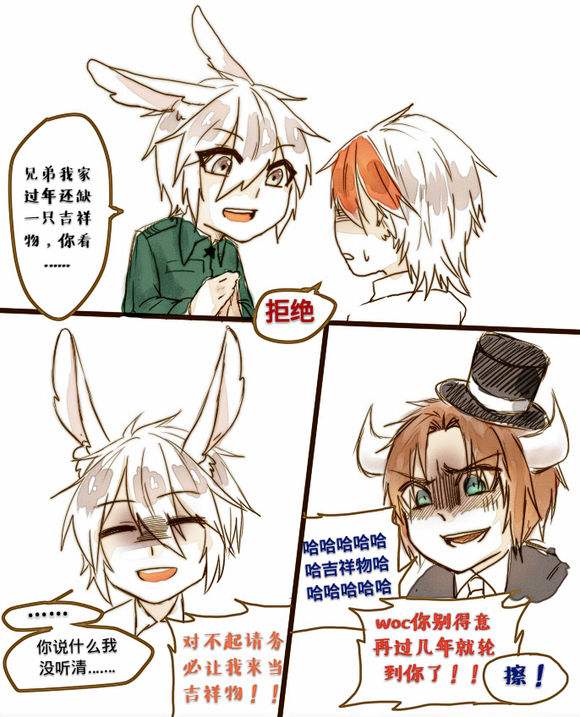 但是《那年那兔那些事儿》和《黑塔利亚》又不太一样。它好像处于某个夹缝之中——它本体就像个同人,历史教科书的同人;但它又真真切切地是个"原著",它有人物,人物有性格,性格跟这些小动物所代表的国家在近代史中的所作所为有关......它的受众和宣传同时来源于军迷、历史爱好者、二次元爱好者还有官方对它的肯定。官方的宣传是《那兔》独有的一个优势。但是如果官方的宣传太过,弄得太正经,就像第四季,过于强调兔子的地位而忽视其他的国家,那就有一股新闻联播的既视感,不能令人信服;