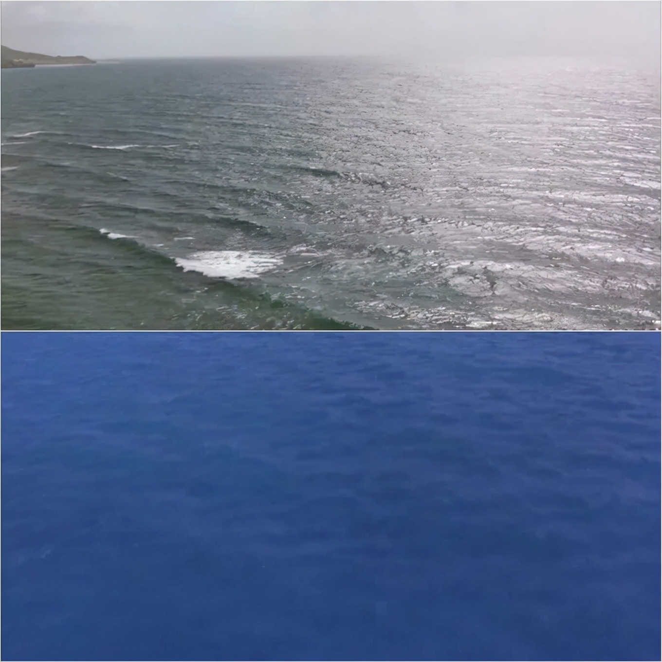 电影最后,瑞德在海边寻找安迪的路途中,海洋的颜色呈现出暗灰色,等他找到安迪时变成了最亮的蓝色。