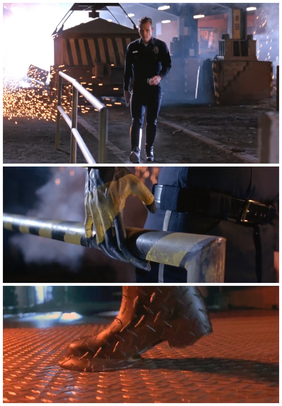 被氮液冰冻后又熔化重组的t-1000机器人,下半身变形功能出现了故障,所以他穿着炼钢厂普通警察的衣服,而下半身却是之前骑警的装备。