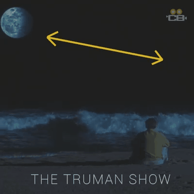 电影中楚门在海边的这一幕,闪电居然短暂地照亮了月球,这已经是在暗示它是假的了。