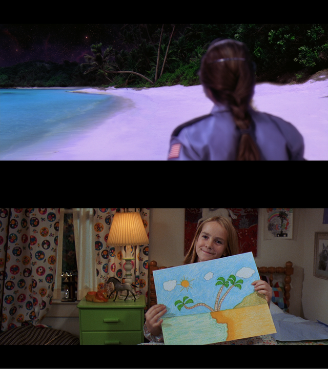 女主角小时候画的画,跟虫洞另一侧世界的风景是一模一样的…