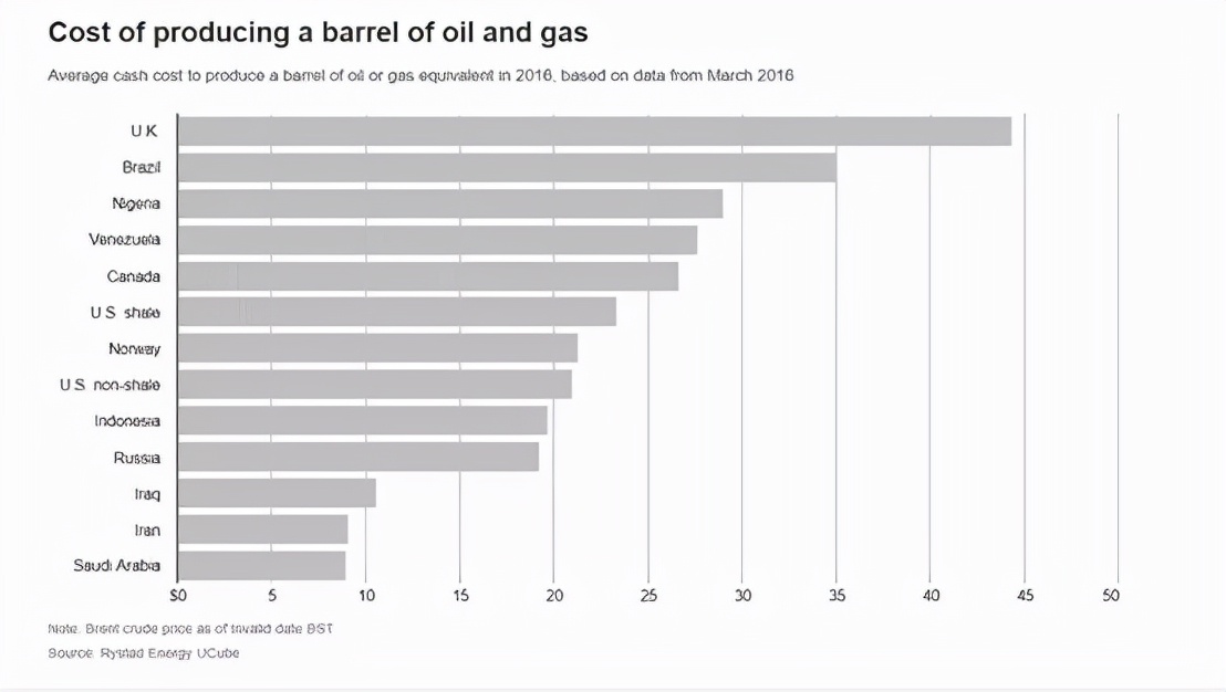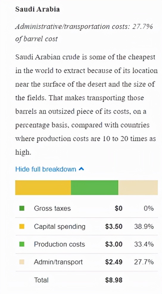 《华尔街日报》2016年4月的报道,当时他们引用挪威的独立能源咨询公司rystadenergy ucube的数据,沙特石油的开采成本为3美元一桶(和阿美石油的招股书2.8美元差不多),各种资本支出为3.5美元一桶,运输管理费用2.49美元一桶,合计成本8.98美元一桶,也就是沙特的生产成本差不多9美元一桶,只有大庆的五分之一。