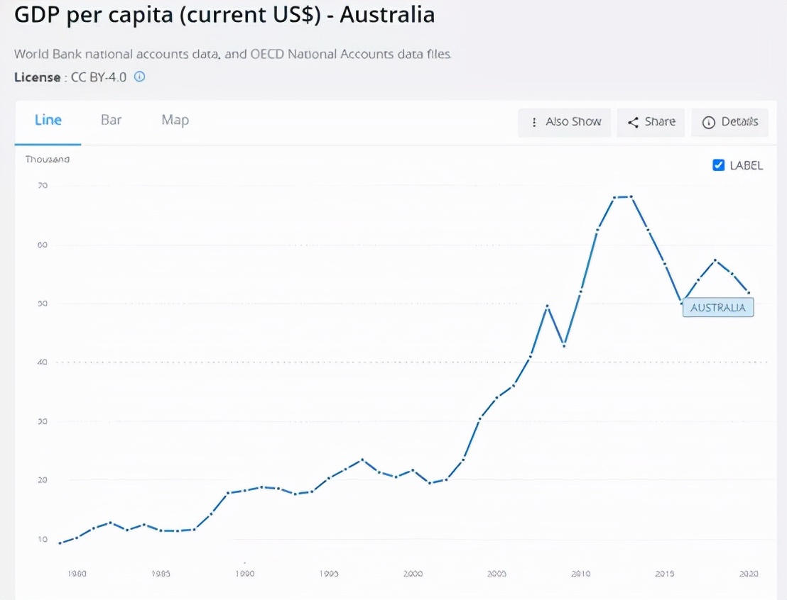 而且由于自然资源价格不会一直上涨,看下图,由于铁矿石等自然资源没有大涨价,澳大利亚2020年的人均gdp还没有2011年高,过去的十年澳大利亚的人均gdp毫无进步。