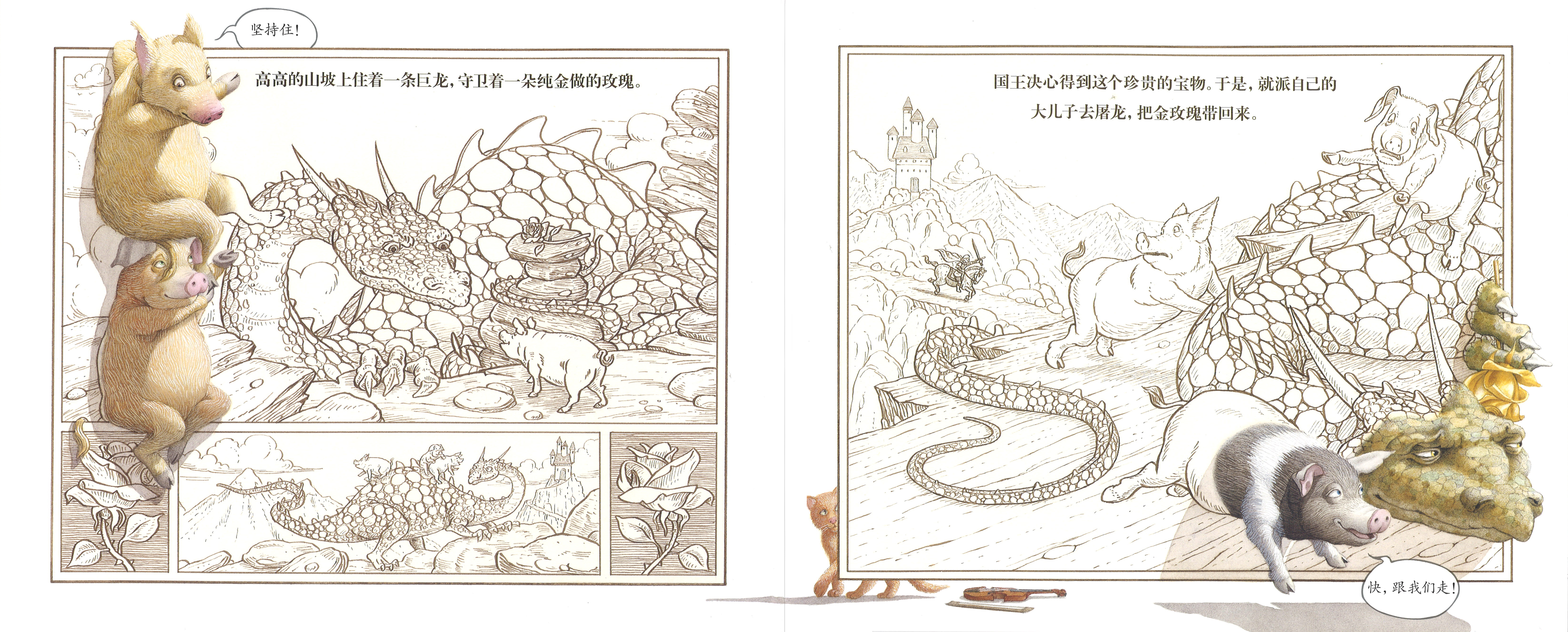 三只小猪也是自来熟,进去之后和龙称兄道弟,还骑在龙的背上四处游览。左边的第二幅,远处出现了一座城堡,这是在暗示王子要来了。果然,他来了,他带着宝剑来了,三只小猪和龙赶紧逃跑,但是要跑到哪里呢?我们可以联想到之前小猪被吃的时候是跑到故事之外获得了安全,三只小猪已经走进走出故事已经得心应“脚”,那么它们和龙成功了吗?此时小猫咪在外面看着故事的发展,等着他们。