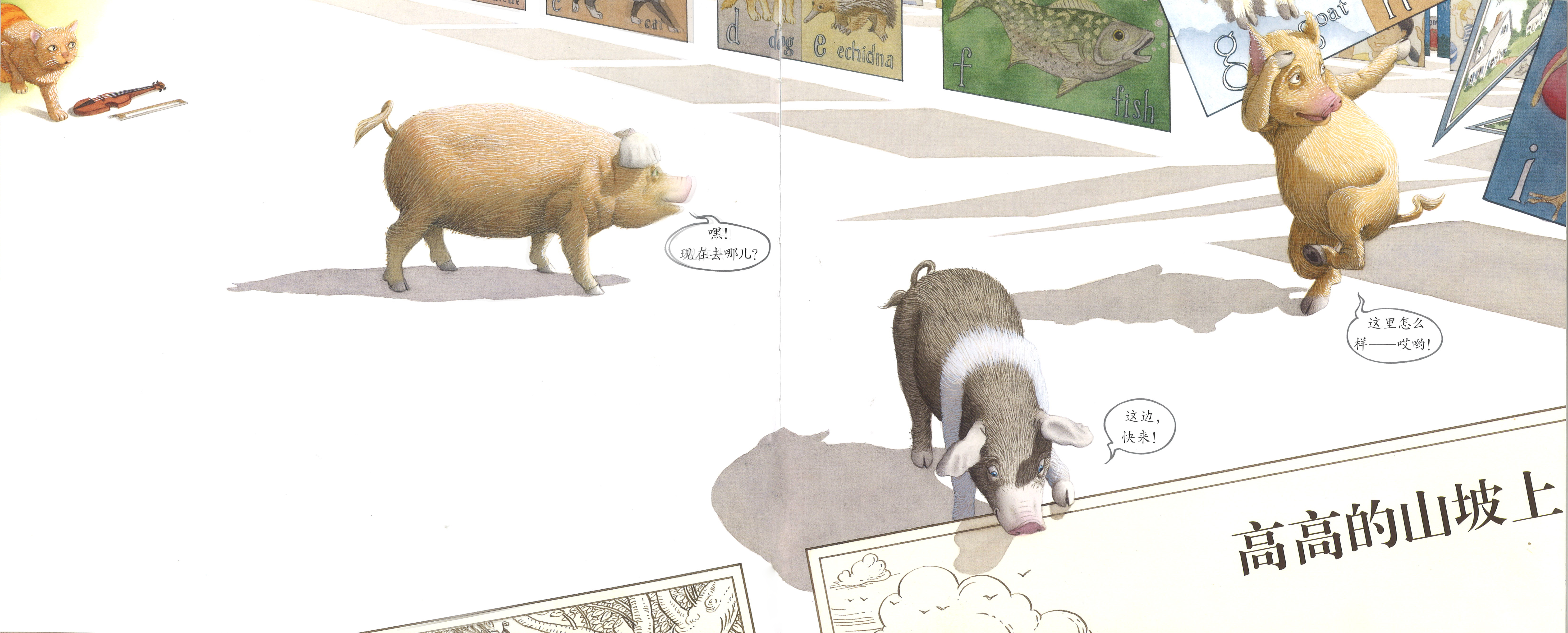 三只小猪出来后又发现了好多故事,这里有各种各样的故事可以选,有dog、fish、cat、goat等等,最引人注意的还是老三发现的,因为这里给龙的故事的版面比较大,也是在铺垫他们接下来要去龙的故事里!