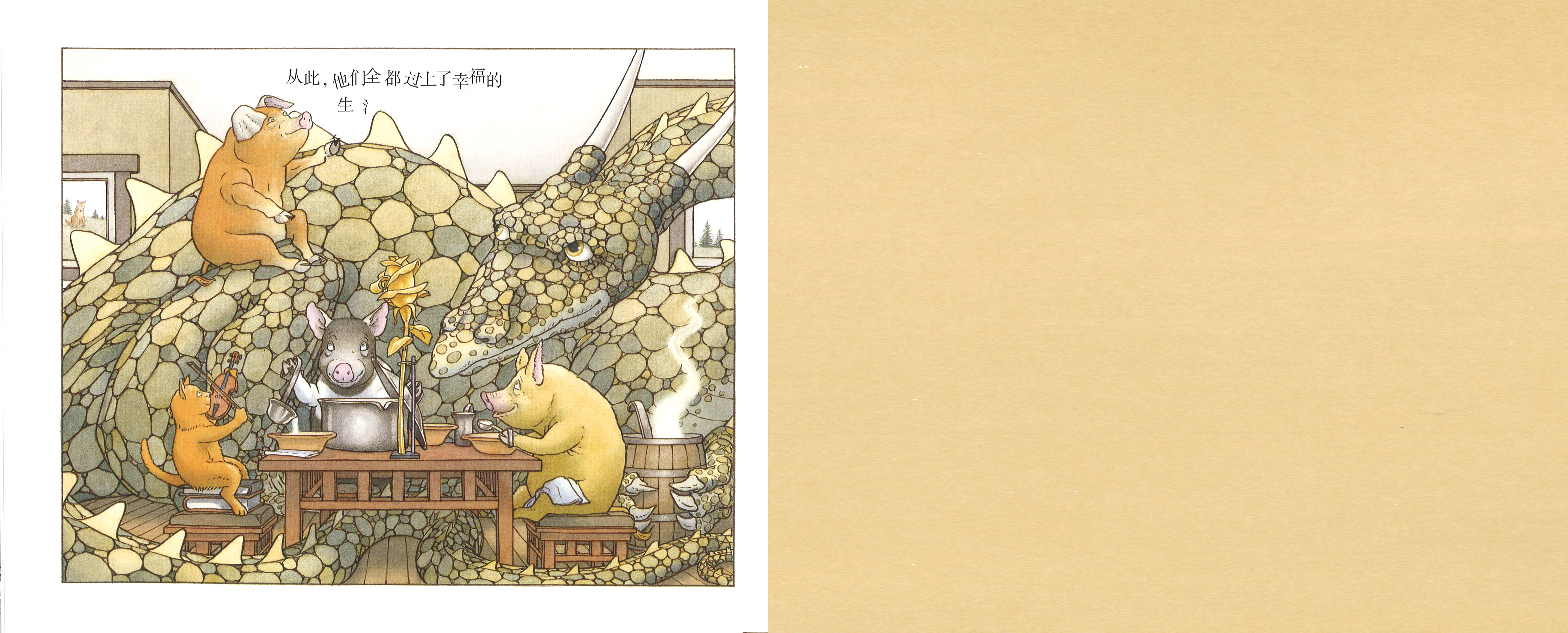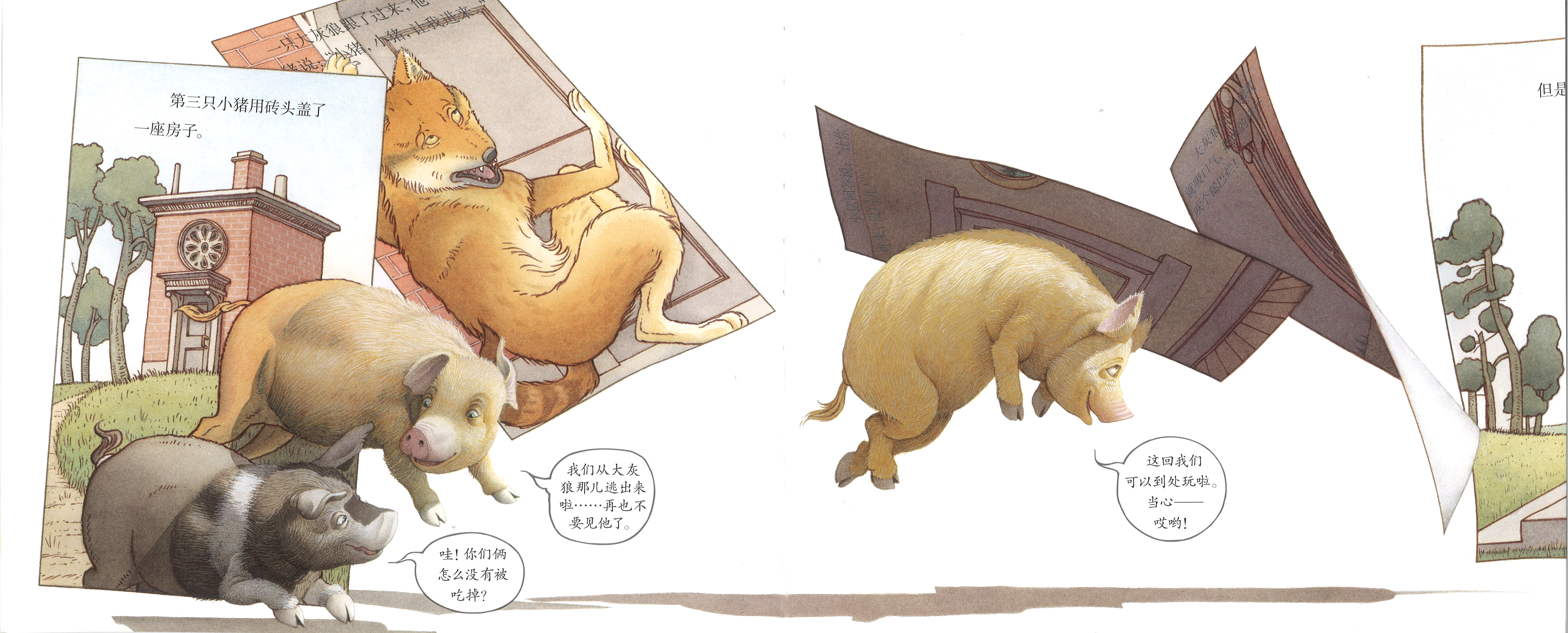 这是为了呼应本书一开始大灰狼把小猪吹到故事外面的设计!前后相呼应!!!