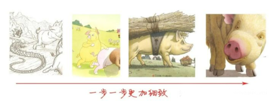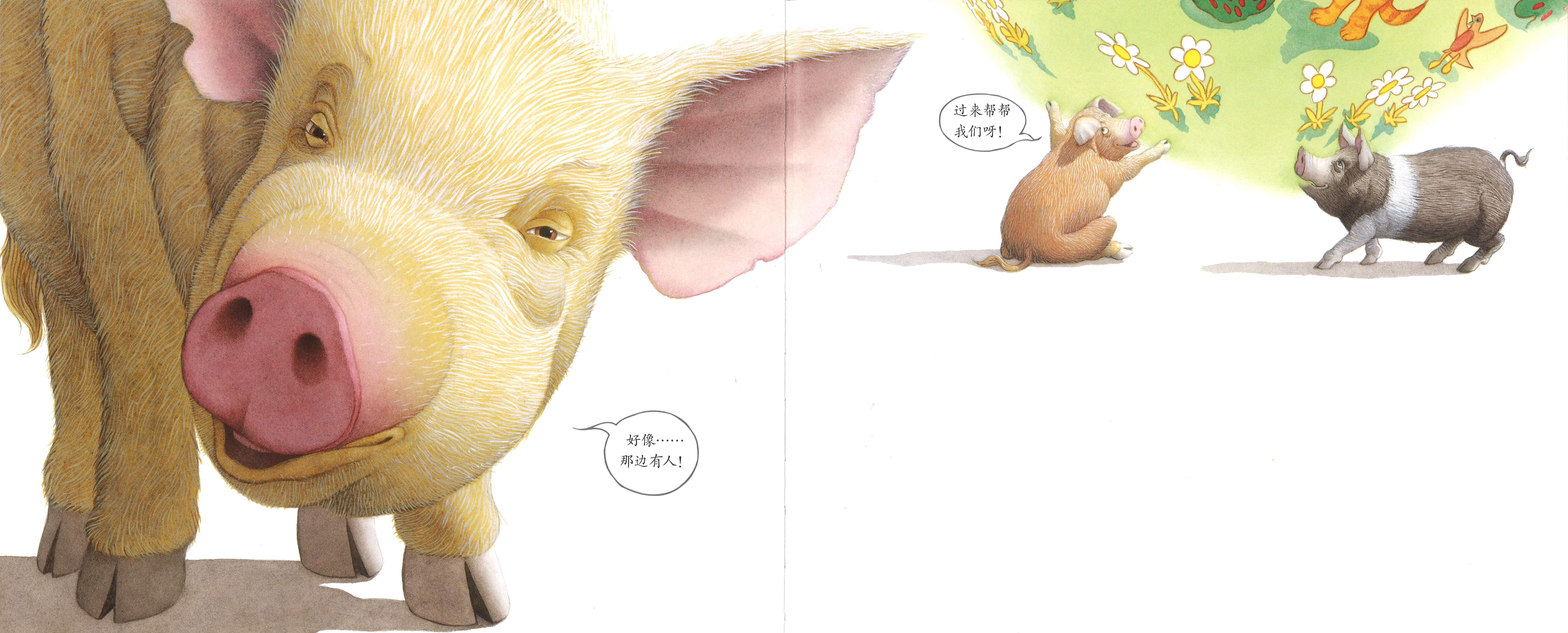仔细观察老二的前半身和后屁股,有没有什么不同?原来故事里的设计有一条黑色轮廓,也不够细致,是种漫画风的设计。而逃出来的小猪,毛发处理的都很细致,外面黑色的轮廓线条也没有了,变得写实了。老二因为还没有完全逃出原来的故事,所以屁股有黑色轮廓,老大因为已经完全逃出来了,完全是写实的形象。看到这里的时候再去翻看前一页,也能发现前一页,老大的脚也没出来!