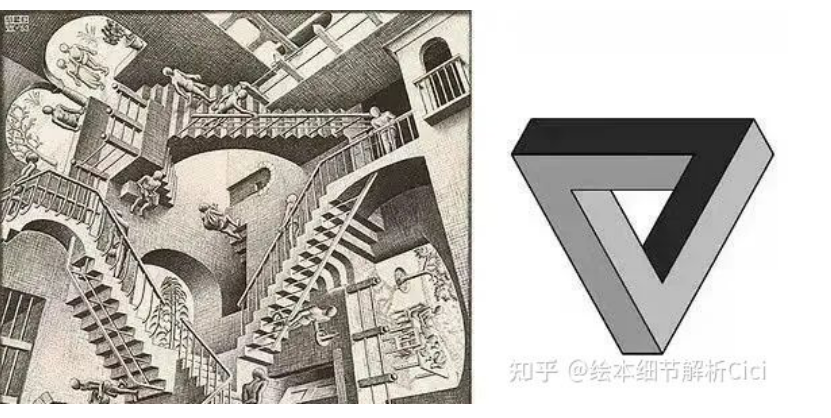上一页老三看到这个故事的时候,老三是踩着这个故事的,故事是铺在地上的。而到了这一页就会纳闷,为什么是爬下去?这种设计方式有点像错位空间,放几张网上找的图感受一下,这样会比较好理解。就是看着又像又不像的设计。