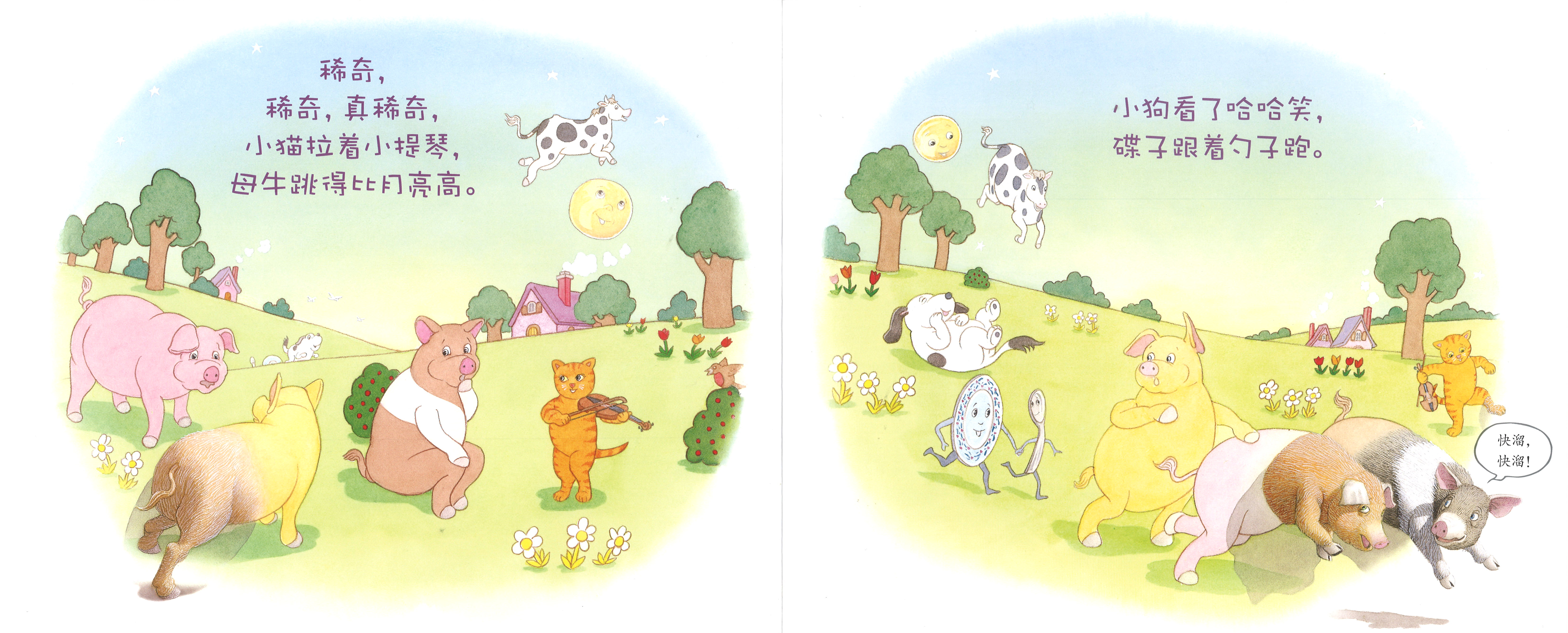 这两页就是鹅妈妈的童谣,画风和前面完全不一样,可爱又卡通,连文字的设计也是很卡通的少儿字体。所有角色的造型都是很简单的线条和色块的形式。连三只小猪进去之后都可可爱爱了,没有毛发的纹理,大大的眼睛,迪士尼在逃公主风格。
