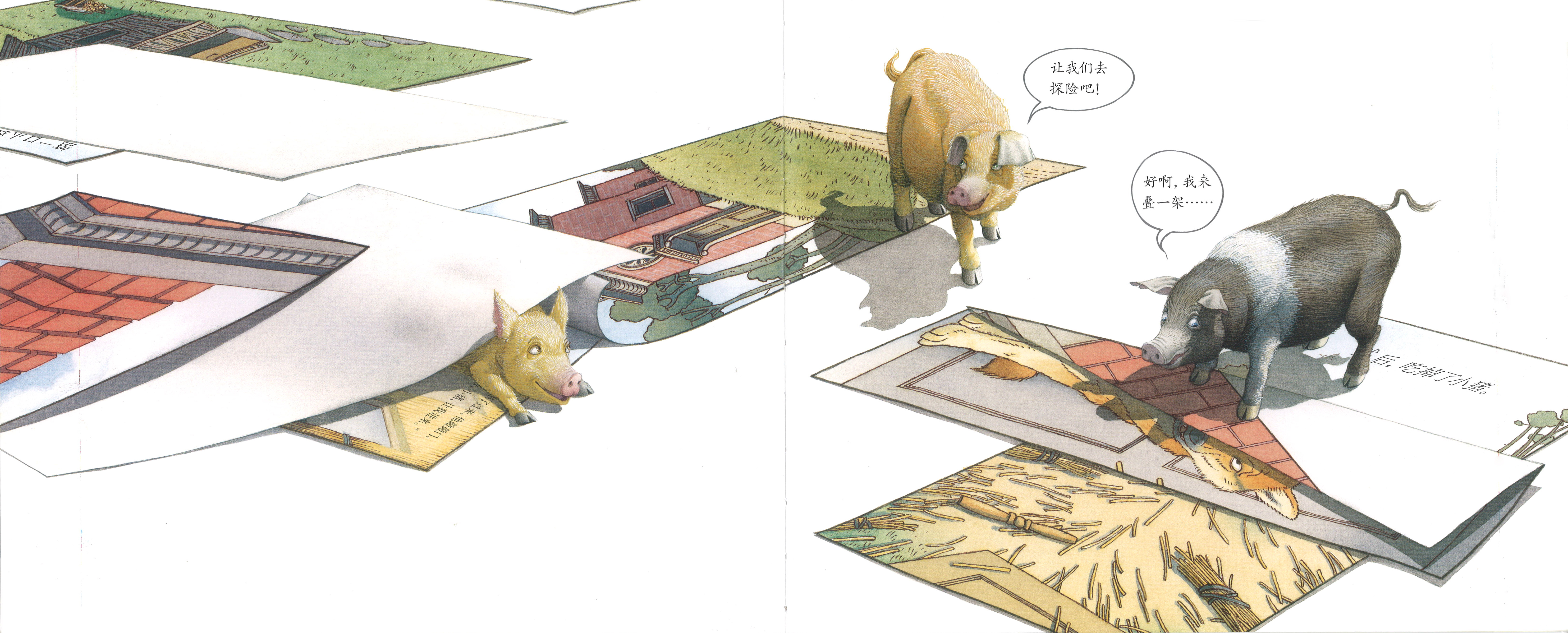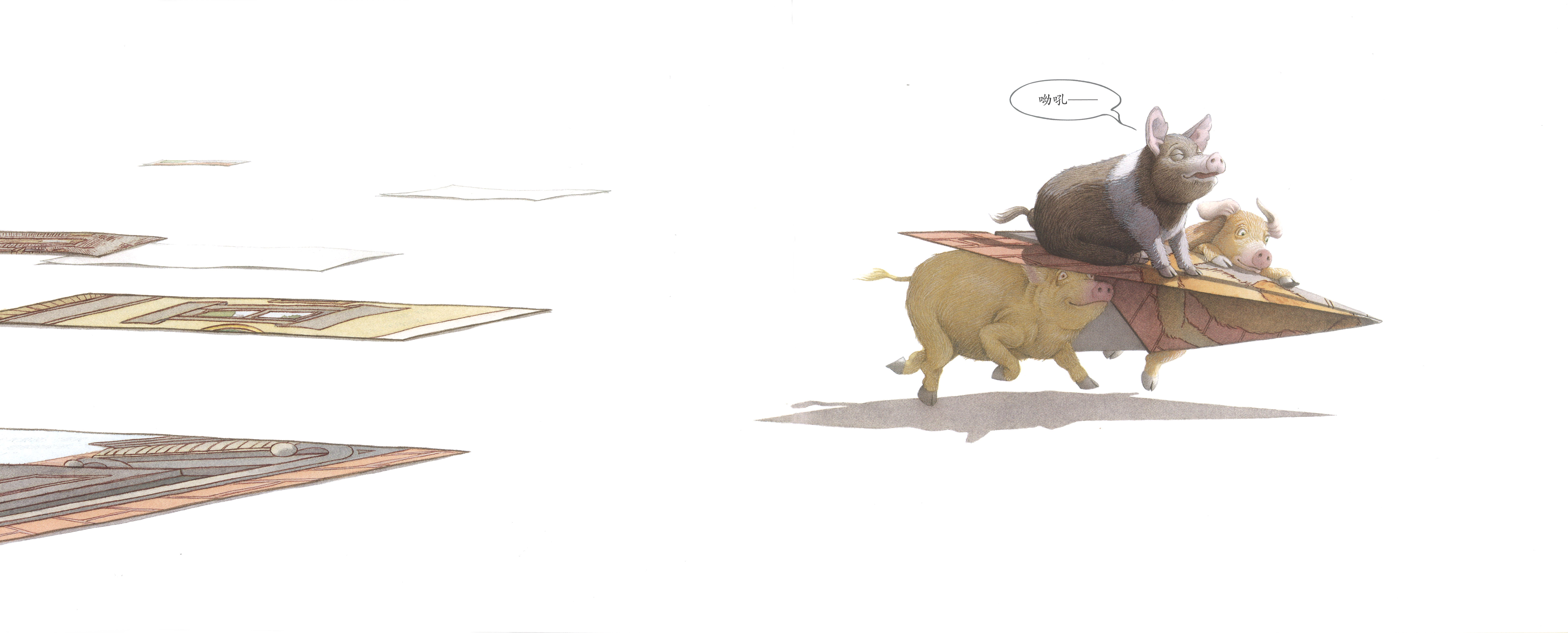 原来他们叠了一架纸飞机,三只猪享受的坐在飞机上,因为飞机起飞时风大,后面的页面都跟着飞了起来了,他们要去哪里探险?这里是三只猪开始起飞的状态,因为地上还有阴影。