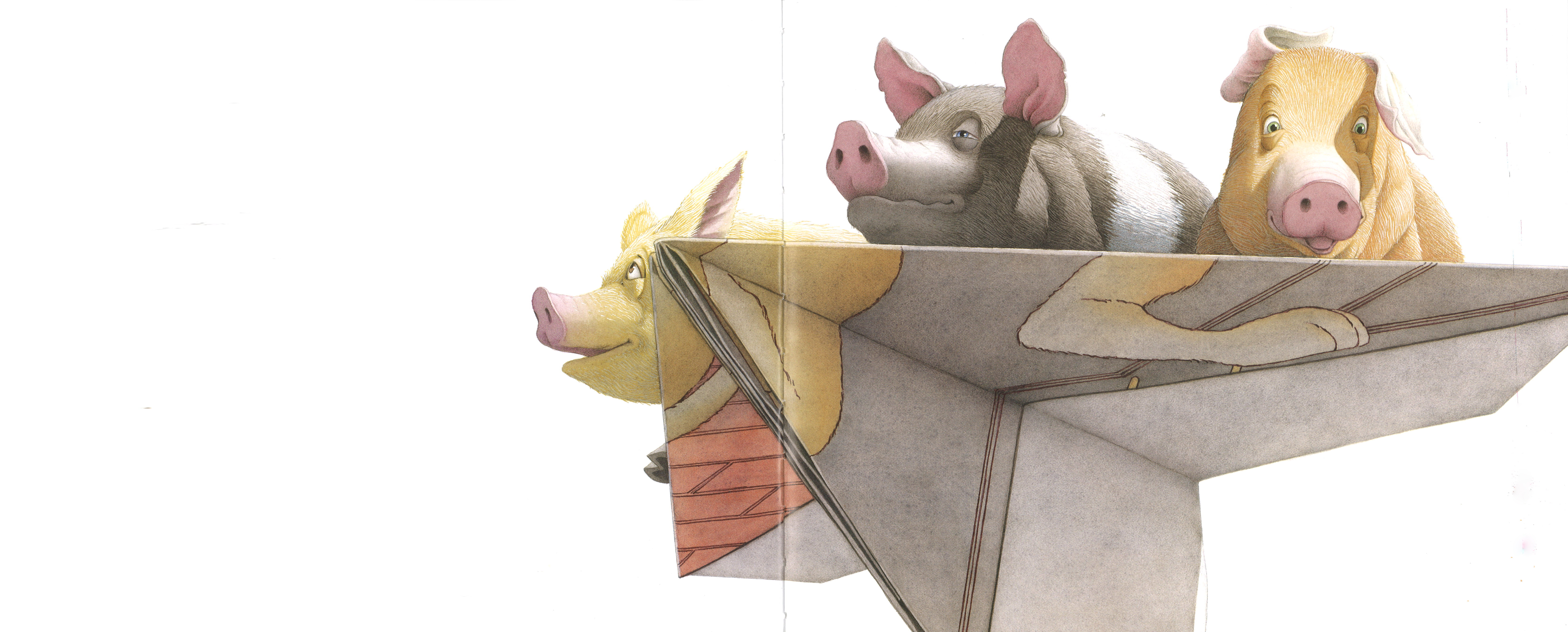 大灰狼的爪子紧紧的卡在这个画面里面,被三只小猪压迫在里面,看上去又爽又痛快。三只小猪对前方充满脸惊讶和憧憬。前面一页是三只小猪的头,后面一页是三只小猪的屁股,设计巧妙。而且这一页飞机是个往下俯冲的状态,这说明它们要降落了。那么三只小猪将会去哪里呢?