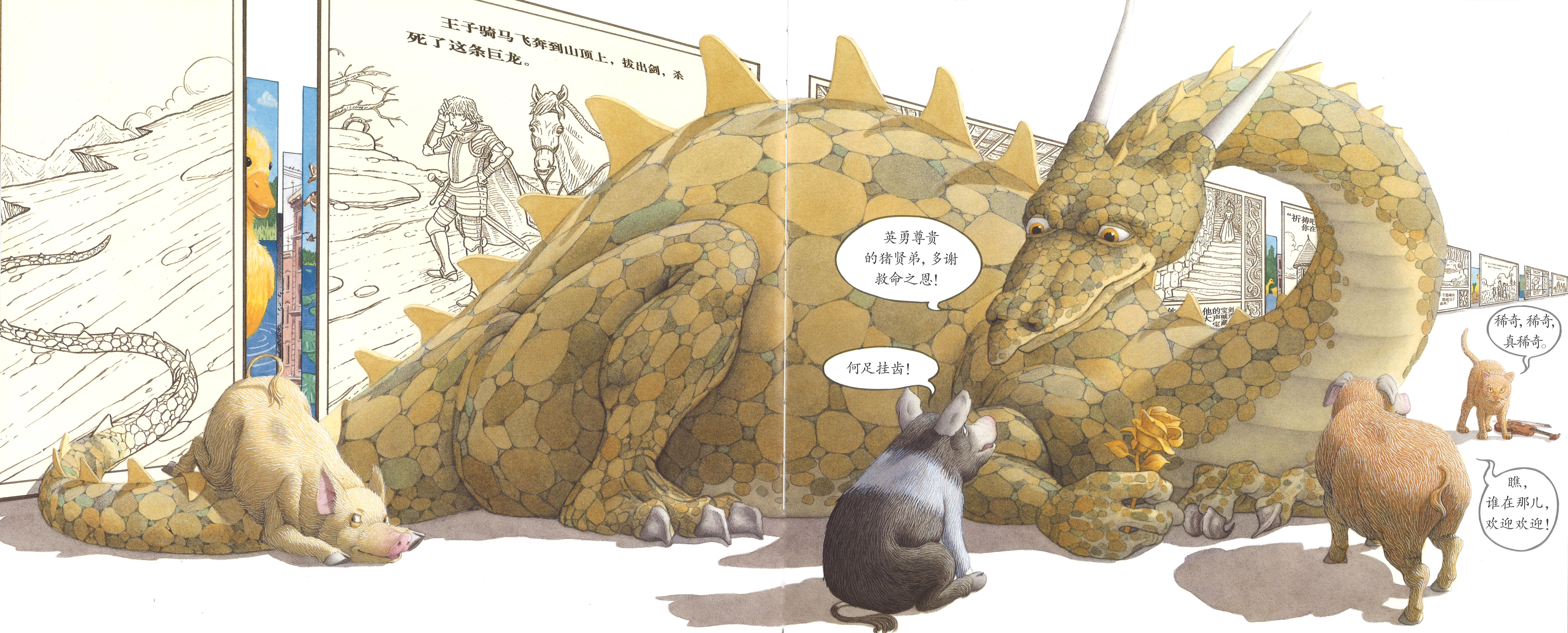 这个页面用跨页展现龙的体积之大,尽管是一个跨页,依然没有把龙的身体完全展现出来,龙尾巴还在故事里。