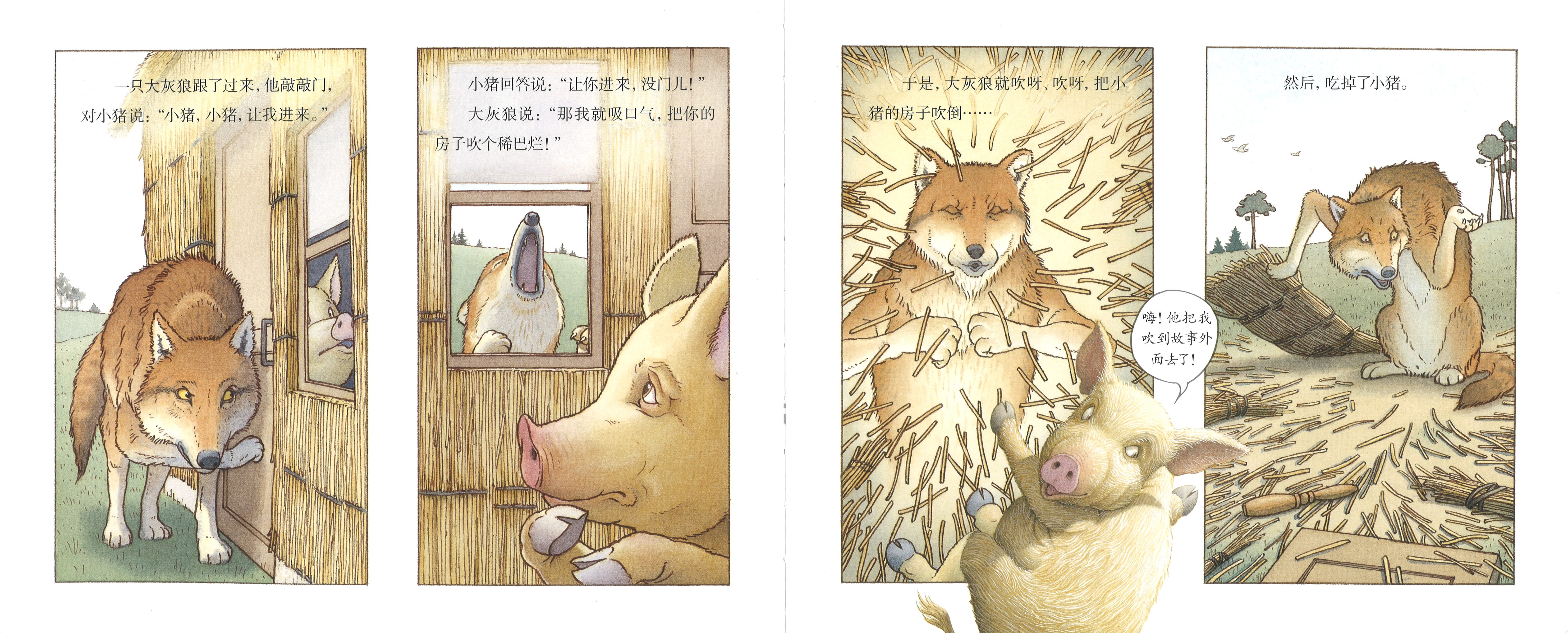 最右边的一幅,大灰狼把小猪吹到了故事的外面,没有把小猪吃掉,并且它也很困惑:明明房子塌了,却找不到小猪。然而文字配的却是“然后,吃掉了小猪”。这是为什么呢,不矛盾吗?