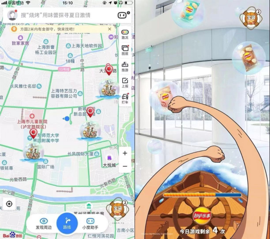 「路飞喊你去寻宝」游戏利用ar技术,实现了品牌突破次元壁的有机结合。百度ar提供技术支持,乐事薯片化身游戏元素“宝袋”,内含惊喜奖品,而航海王ip就是最佳的剧本。只要开启百度地图app即能进入“大航海时代”。此外,界面设计非常直观,用户带入路飞视角,转动手机寻找立体型的乐事包装宝袋,蓄力路飞的橡胶手,操控舵盘瞄准,抓取宝袋。抓到时会有胜利的音效,抓不到时也会有可爱的语言调侃,交互细节也促进了代入感。这些创意小细节的精心设计,让用户体验得到进一步的升级。