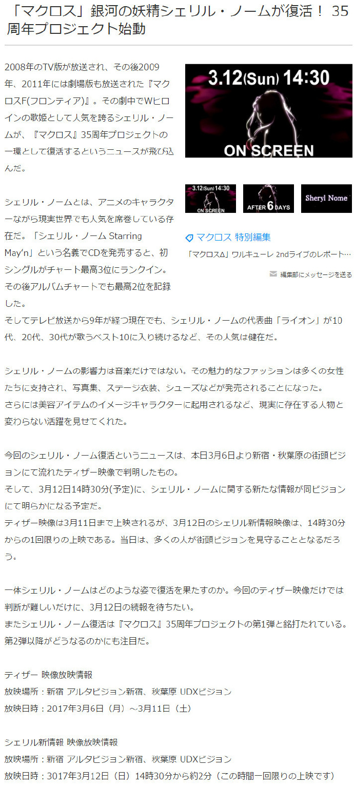在日本时间3月12日下午2点半,官方将会公开关于“雪莉露复活”的最新情报影像。作为《超时空要塞》35周年企画第一弹,肯定会备受粉丝们的关注,至于会推出怎样具体的策划就让我们拭目以待吧~