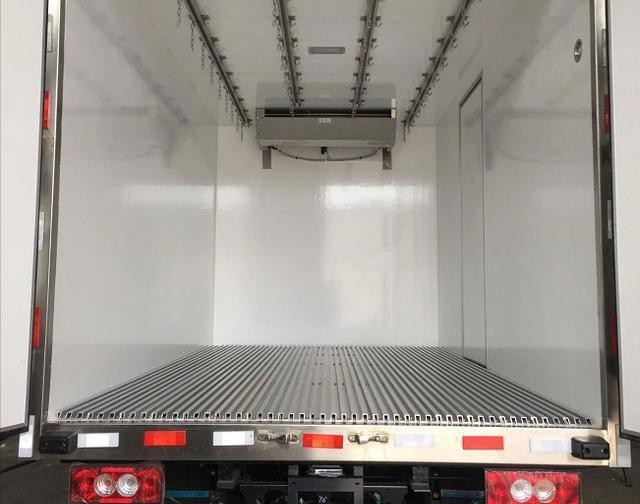 定制冷鲜肉运输车:顶板和侧板预埋承重板材,增加承重力;后门框加固,确保满载时,门框不变形。顶板按厢体体积加装挂肉导轨,导轨设有限位卡座,减少货物滑动,提高车辆行驶安全性。