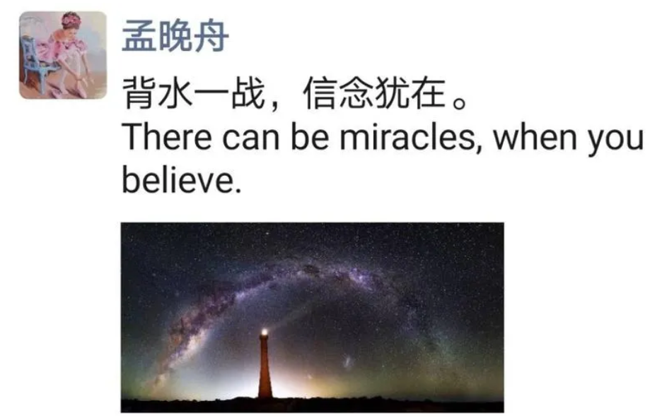 8月18日凌晨,孟晚舟发了一条朋友圈:背水一战,信念犹在。
