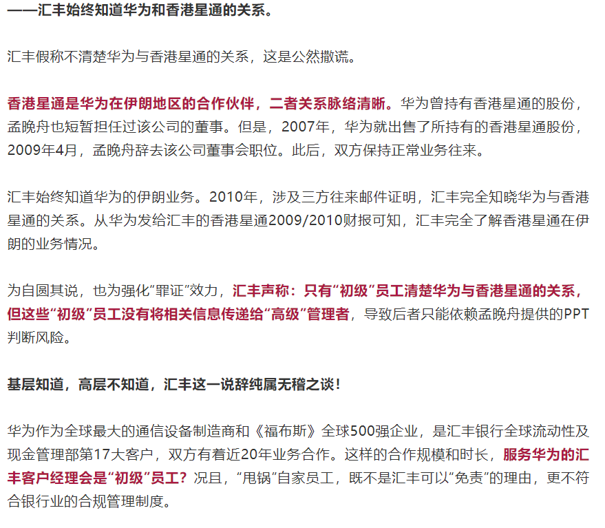 " 孟晚舟说到skycom和华为的关系,汇丰便兴冲冲的拿去给美国邀功。