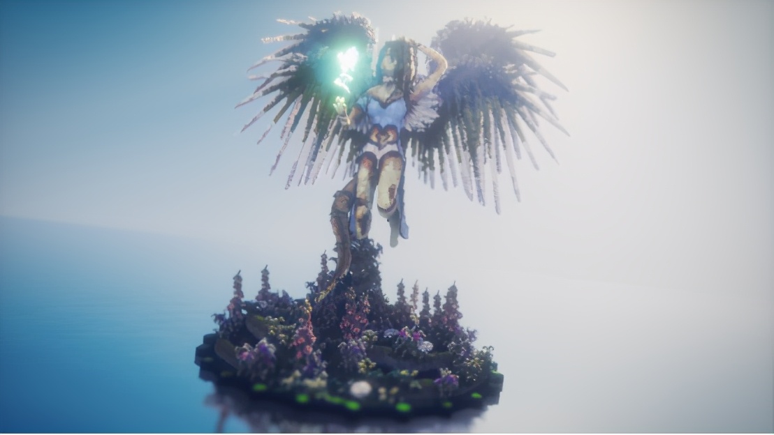 这个天使看上去就接地气了很多,她踩在一片长有紫色植物的小岛,这些紫色植物跟她的翅膀也非常的搭配。