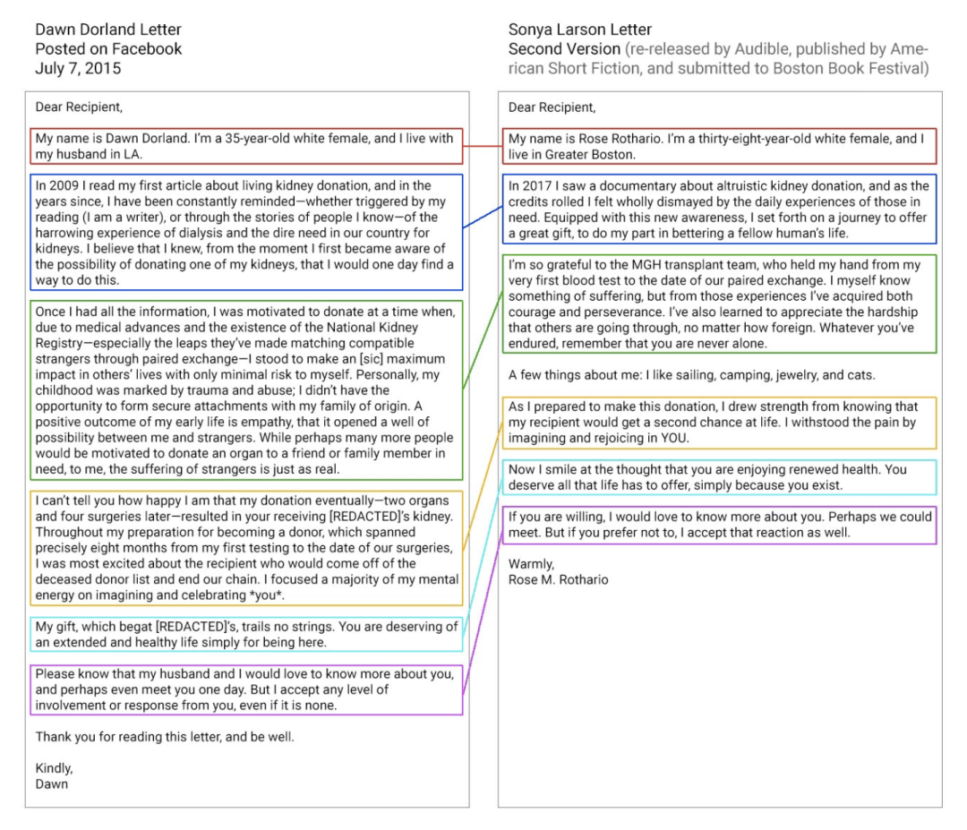 拉尔森和多兰的成长环境完全不同。她出身中产家庭,母亲是华裔,父亲是白人,相比多兰可以算是条件优渥。但在她的小说里,白人女主角成了靠捐肾来博关注的“圣母白莲花”有钱人,而接受捐赠的角色是家境贫寒的华裔,在贫困和捐赠人的傲慢自大中挣扎。在这篇小说里,拉尔森甚至直接化用了上文提到的多兰写的公开信。