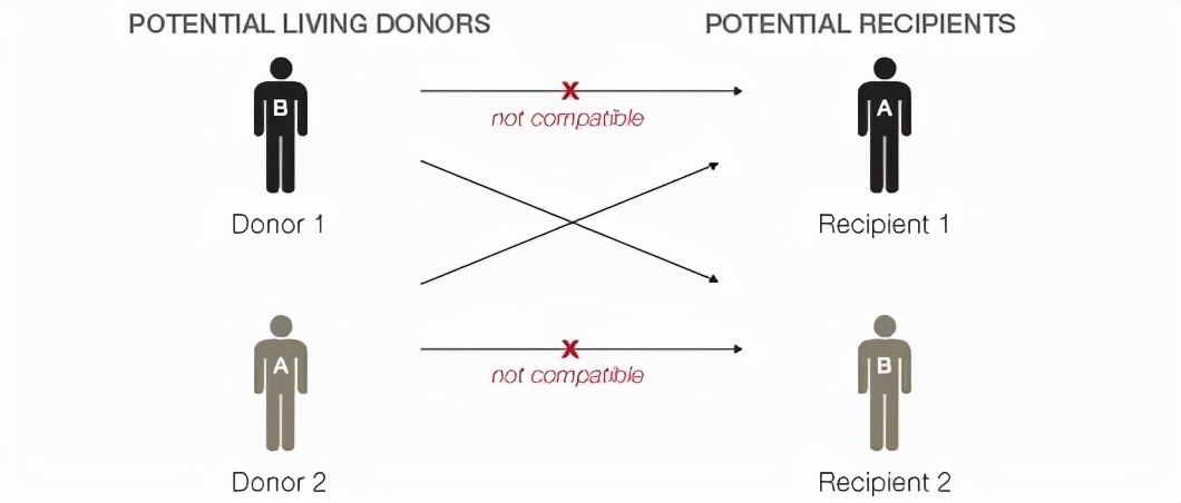 有时,医疗中心会在两对无法配型成功的捐赠者和受体间进行交换配对,但是找到刚好能交换的配型的两组人难度极大,成功案例不多。
