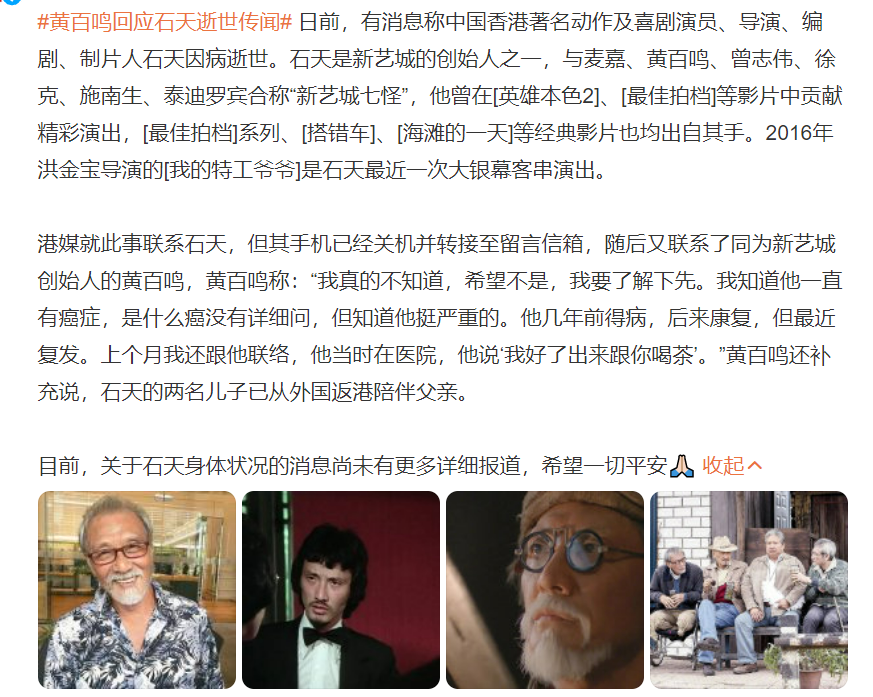 随后有媒体联系了黄百鸣,但黄百鸣却表示自己暂时还没有收到消息,希望不是真实的,毕竟上个月还在住院中的石天还曾约自己一起喝茶,突然传来好友去世的消息,黄百鸣也暂时不敢相信。
